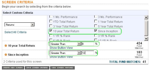 Put check marks next to the individual items that are important to you. In this image, I only want mutual funds that have averaged at least 8% over the last 10 years and at least 12% since the fund was created.