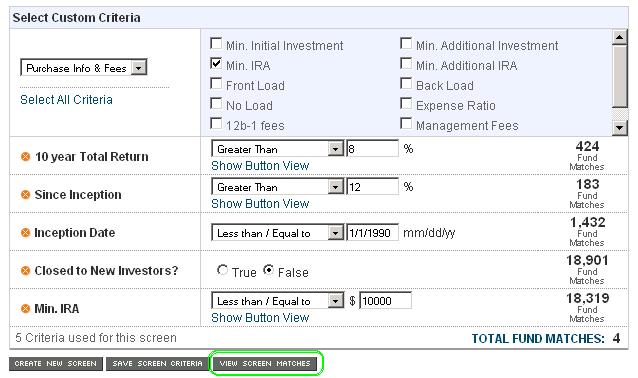 Continue to add attributes until you have everything that you want. Once you're ready, click on "View Screen Matches". It will then show a list of all matching mutual funds. In my search, I am looking for funds that did at least 8% over the last 10 years, 12% since inception, are at least 18 years old, are open to new investors, and require less than a $10,000 initial investment inside of IRAs.