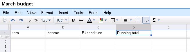 In the first row, type in the following headers. Column A - "Item" Column B - "Income" Column C - "Expenditure" Column D - "Running total"